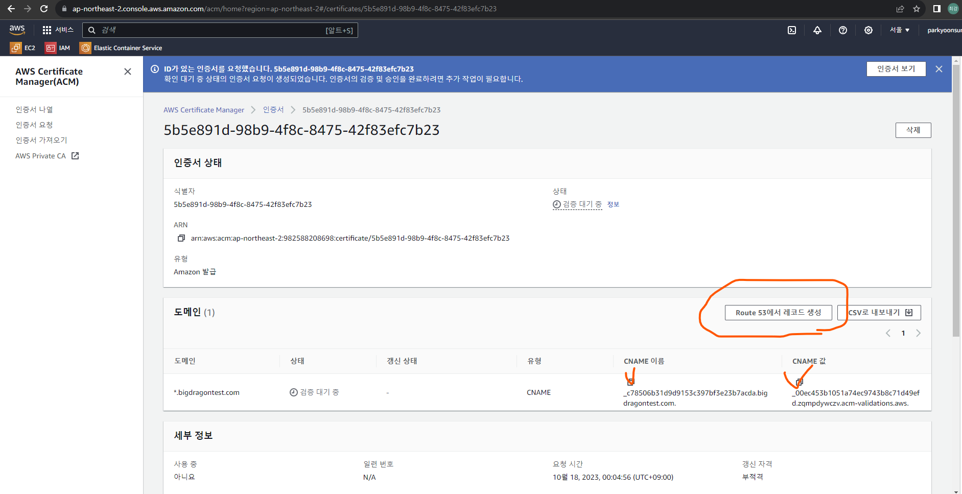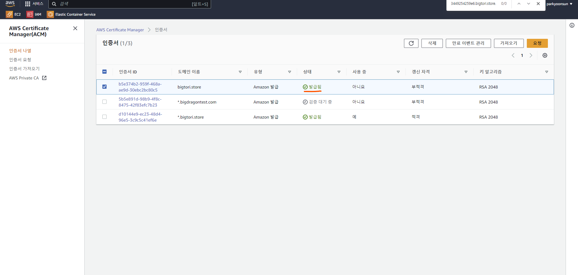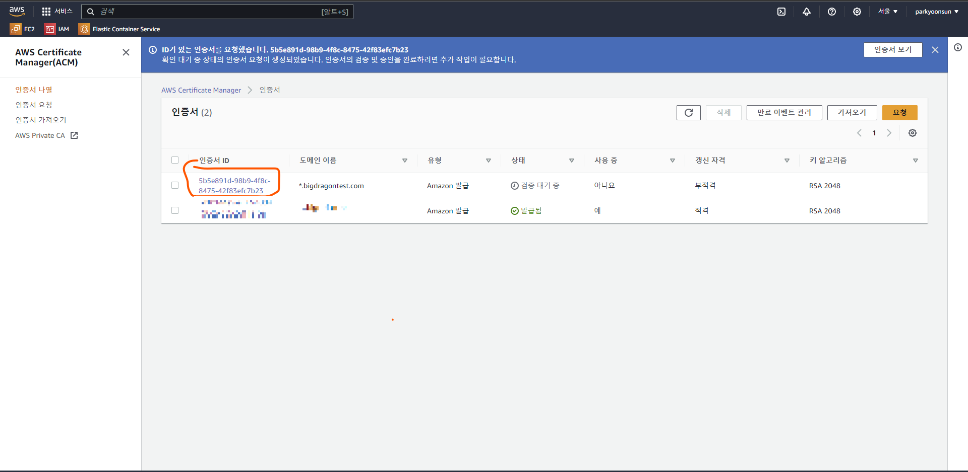 4. 요청한 인증서의 상태가 [검증 대기 중]인 것을 확인할 수 있습니다.