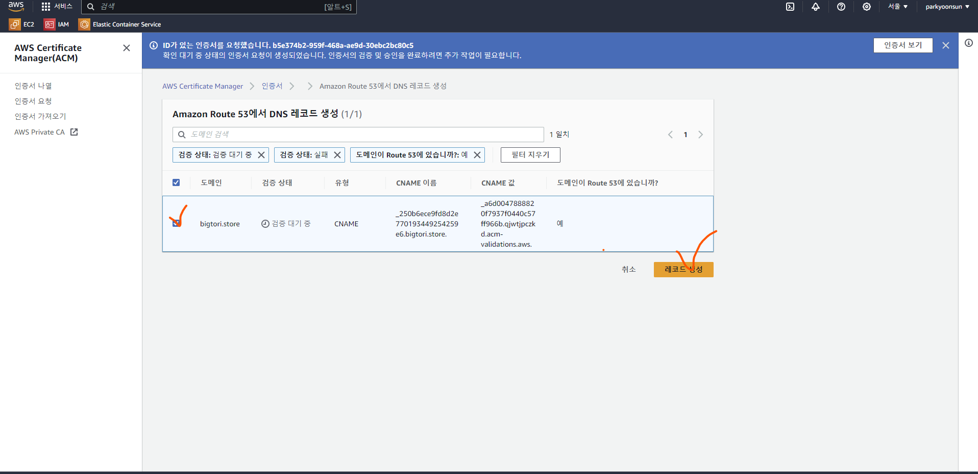 5. [CNAME 이름]과 [CNAME 값] 을 복사하여 기록해두고 [Route S3에서 레코드 생성] 버튼을 클릭합니다.