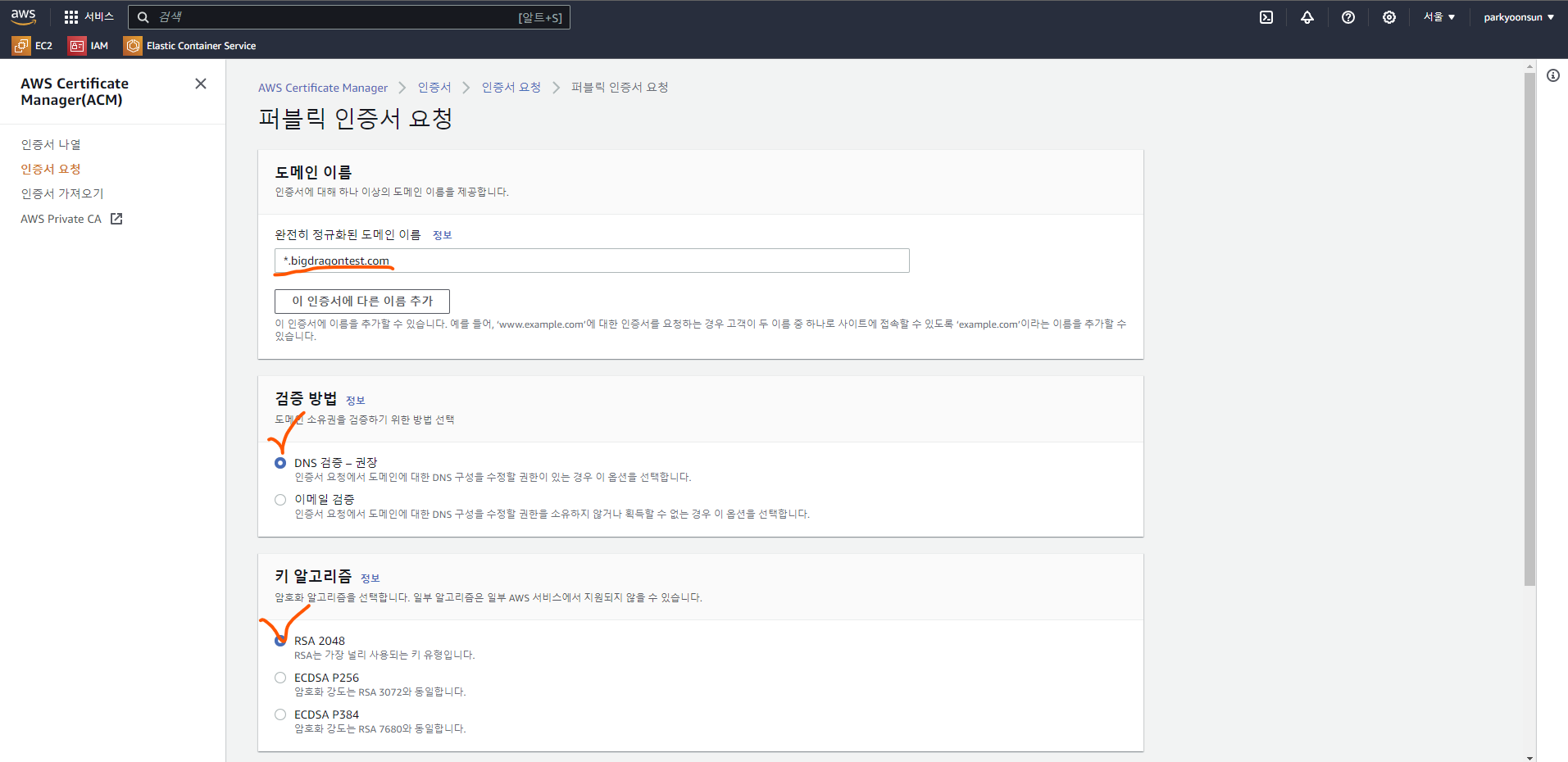 AWS의 ACM ( AWS Certificate Manager ) 을 이용하여 SSL 인증서를 적용하기로 하였습니다.