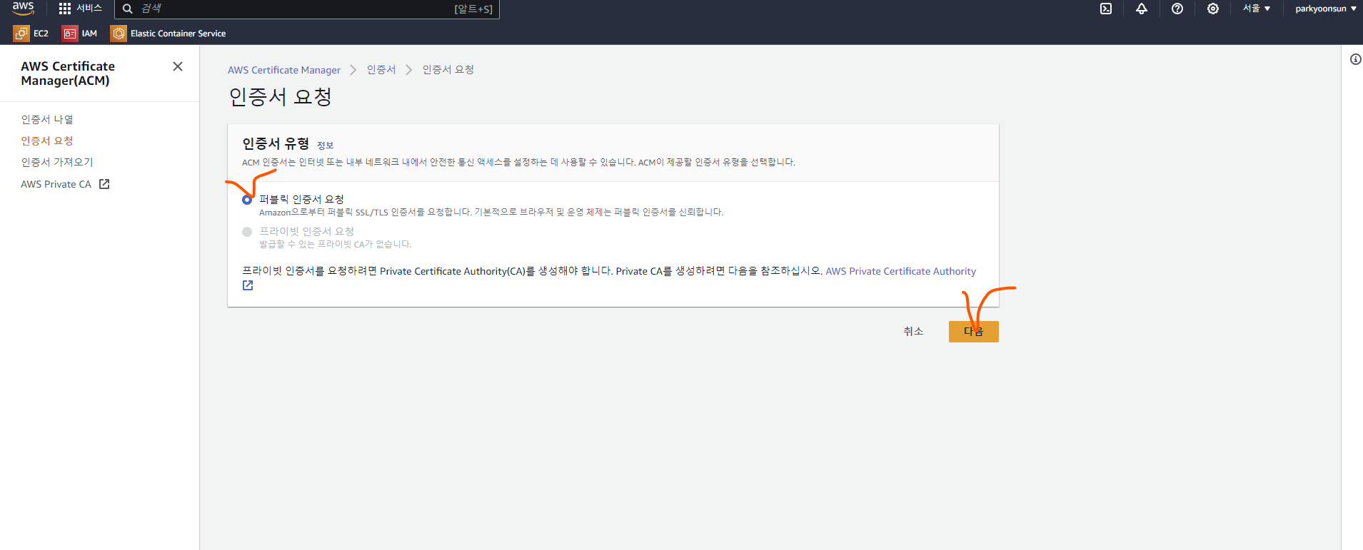 2. [퍼블릭 인증서 요청] 체크 후 [다음] 버튼을 클릭합니다.