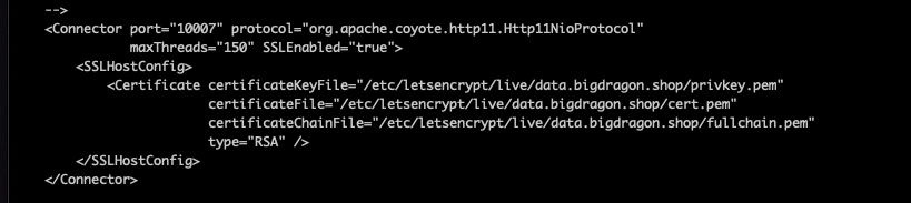 톰캣의 server.xml 부분에도 인증서 경로에 맞게 작성을 해주면 된다.