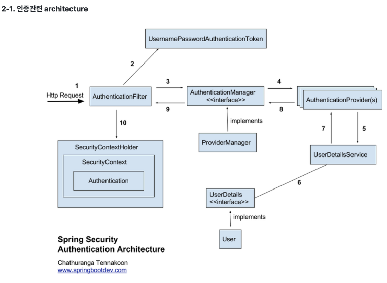 - (UsernamePassword)AuthenticationFilter : (아이디와 비밀번호를 사용하는 form 기반 인증) 설정된 로그인 URL로 오는 요청을 감시하며, 유저 인증 처리