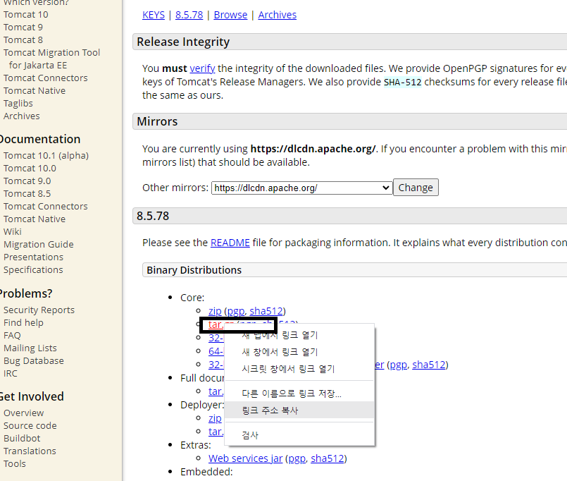 터미널에서 다운 받을 수 있습니다. 해당 이미지처럼 톰캣홈페이지에서 다운받을 버전의 tar.gz마우스 오른쪽 클릭 후 링크를 복사한 후 터미널에 해당 명령어를 입력합니다.